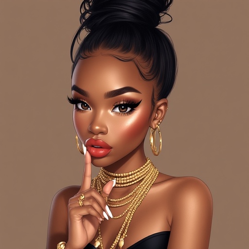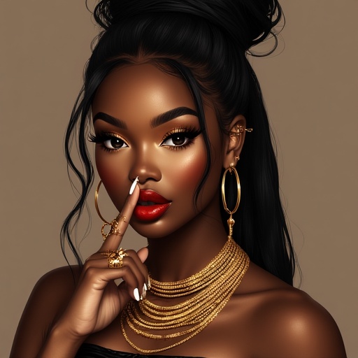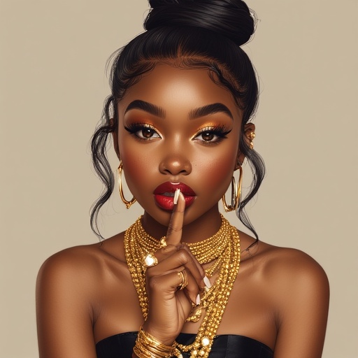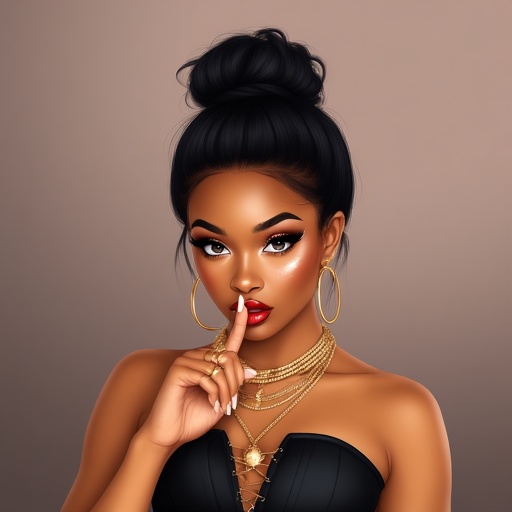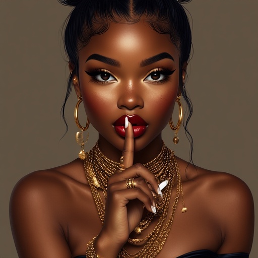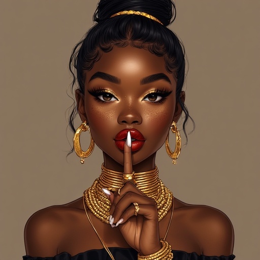 Draw me a portrait using this close-up image of a young BLACK AFRICAN Kenyan woman with BLACK hair and dark African skin, styled in a high, messy bun. A few loose strands frame her face. She has striking makeup, with sharply defined black cat-eye eyeliner, well-defined eyebrows, red lips, brown eyeshadow, subtle blush, and highlighter. She’s making a ‘shushing’ gesture with the index finger of her right hand to her lips. She’s wearing a strapless black corset top, revealing her shoulders. Many gold accessories adorn her neck and hands: several necklaces of varying lengths, some with pendants, large gold hoop earrings, and rings on her fingers. Her nails are long and white. The background is a plain, neutral brown, creating a contrast with her gold jewelry and skin tone. Keep facial features as clear as possible shhh… Don’t tell everyone