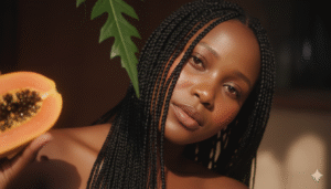 A hand is holding a slice of papaya