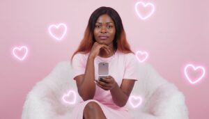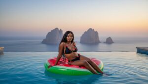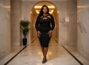 Black woman standing indoors in an elegant, modern marble hallway