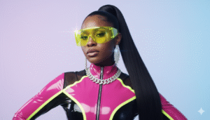 Wearing oversized neon yellow transparent visor sunglasses with a glossy finish.