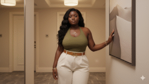 Standing powerfully inside a luxurious modern highrise elevator with gold metallic walls