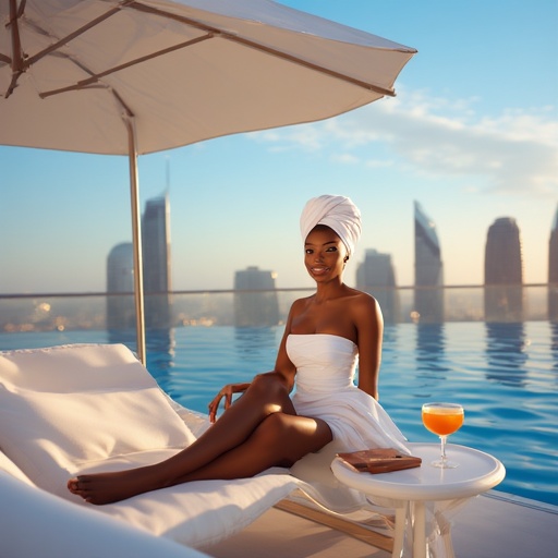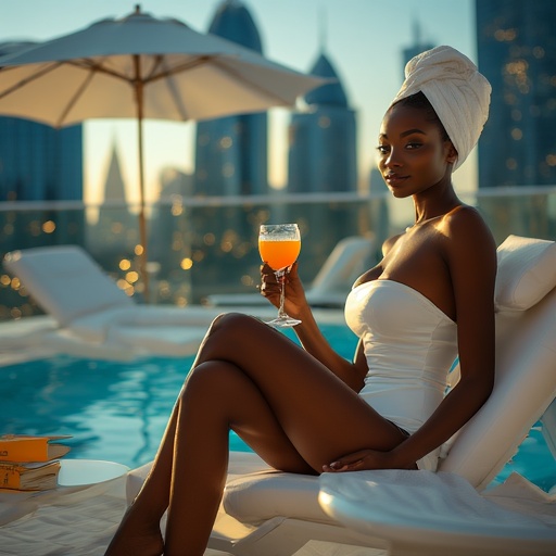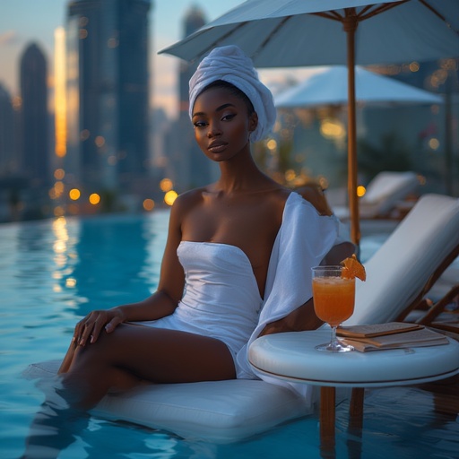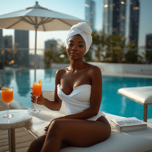 “A breathtakingly sharp, ultra-realistic, photorealistic masterpiece at 16K resolution, capturing a stunning woman, using the provided image as the exact face reference with 100% accuracy and no deviation. She is elegantly sitting upright on a luxurious white poolside lounge chair, positioned on a sophisticated rooftop hotel pool deck, facing slightly towards the camera with a relaxed and engaging expression. Her eyes are open and looking subtly towards the cocktail in her hand or just past it, conveying enjoyment. A pristine white towel is wrapped perfectly as a turban, signaling a chic, post-swim or spa luxury vibe. She is wearing a sleek, form-fitting white strapless one-piece swimsuit, emphasizing her toned physique. Her posture is graceful and elegant, embodying high-fashion ease, with one hand gently holding the orange cocktail glass, raised towards her lips as if taking a sip, ensuring the glass does not obscure her face, and the other arm resting comfortably on her lap or the lounge chair. Her legs are gracefully crossed at the knees, with her feet lightly touching the deck. To her side, a pristine white poolside umbrella is open, providing elegant shade and complementing the luxurious setting. Next to her, within easy reach, is a small, elegant white side table. On this table, there is one closed, regular-sized hardcover book with an English title visible on the cover, placed directly on the table surface (separate from the glass). The foreground prominently features the sparkling blue water of the rooftop swimming pool, with captivating reflections on its surface. The background showcases a vibrant, modern city skyline with towering high-rise buildings, beautifully blurred with a soft bokeh effect and subtle, shimmering light orbs, creating an exclusive, upscale urban atmosphere without distracting from the main subject. The lighting is a stunning, warm golden hour glow, meticulously crafted to create exquisite highlights and soft shadows that sculpt her body, emphasize the textures of the towel, swimsuit, lounge chair, table, glass, and book, and illuminate her features with a flattering, editorial quality. Every detail is rendered with impeccable clarity and precision. The overall image exudes a sense of expensive high fashion, summer luxury, and refined glamour, with a focus on an incredibly beautiful and harmonious color palette. Captured with an ultra-high-resolution professional camera, ensuring breathtaking sharpness and unparalleled visual quality, perfectly suited for a prestigious fashion magazine cover.