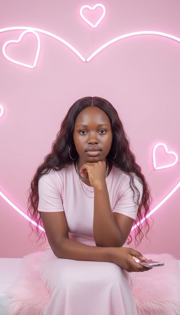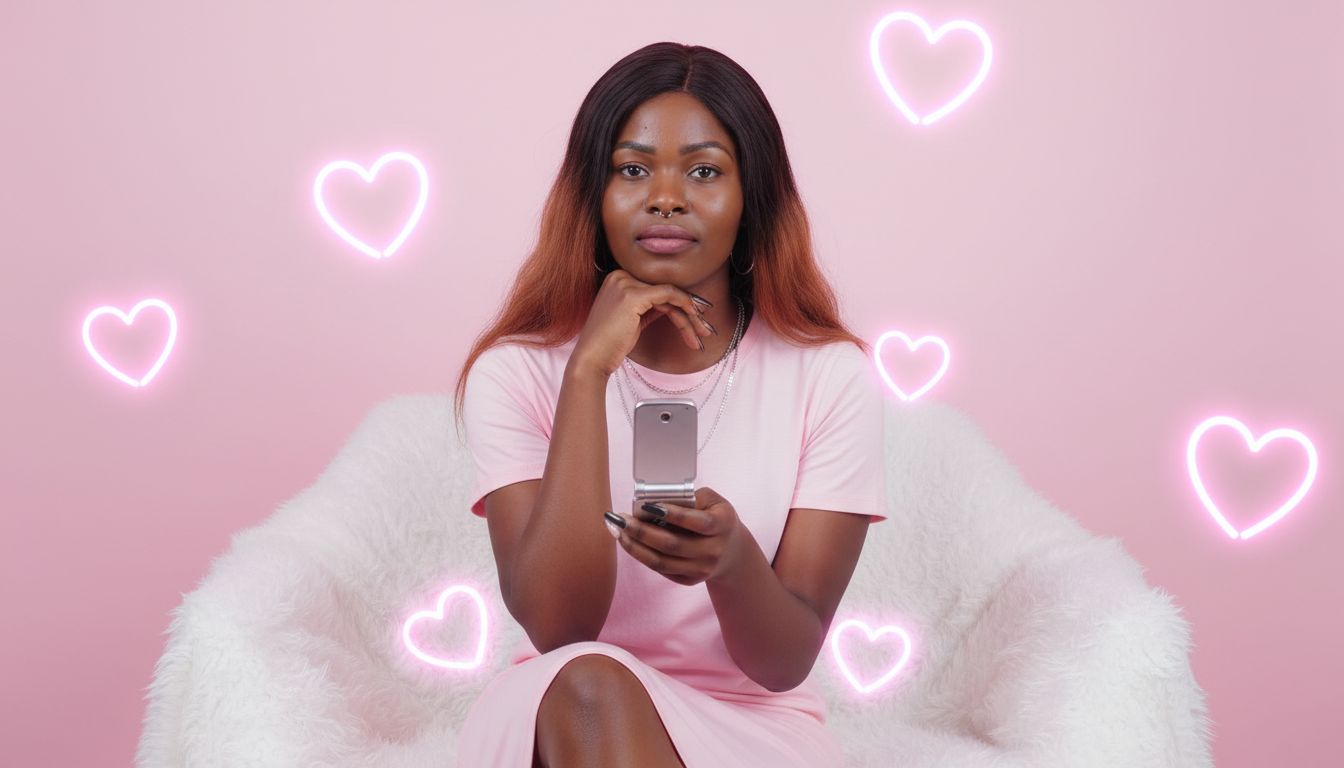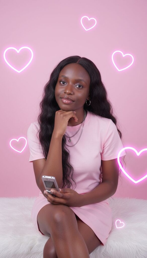 Create a waist-up portrait of a young woman with long, wavy dark hair, styled with a center part. She is sitting against a solid light pink background, with several glowing pink neon heart shapes around her. She is wearing a simple light pink t-shirt dress and several silver necklaces. She has a nose ring and hoop earrings. Her right hand is resting under her chin, and she is holding a small, silver flip phone in her left hand. She is sitting on a white surface covered with light pink faux fur. The lighting is soft and even. Use the uploaded photo as reference. Copy my face 100%.