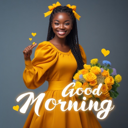 Create ultra-realistic cinematic glamour image 100% copy face , identical to the attached image. A young Kenyan woman curvy body with winks playful. Pose & Expression: She is smiling radiantly and making a small Kenyan finger heart gesture (or similar “come hither” hand motion) with her right hand toward the viewer. She is looking directly at the camera. Attire: She is wearing a bright, mustard-yellow or deep orange dress with long sleeves, featuring a pleated or flowing skirt. Hair: Her hair is styled in two high braided pigtails tied with matching yellow bows. She has soft bangs. Accessories: She is holding a large, beautiful bouquet of vibrant, warm-toned yellow or orange roses (or similar flowers) with a few small blue/purple accent flowers and green leaves. The flowers are partially obscuring her left arm. Background: Simple, soft, out-of-focus background in a slightly muted cool tone (grey or light blue) to make the yellow dress and flowers pop. Overlays & Text: Floating Elements: Small, stylized, golden or yellow heart shapes are floating around the subject (especially near the head and on the sides). Text Overlay: The words “Good Morning” are prominently displayed in a large, elegant, flowing white script font at the bottom center of the image. The text might have a subtle drop shadow or glow. Soft, dramatic high-key lighting, beautiful skin texture, elegant, shallow depth of field. Realistic high detail HD shot and glamour shot. lifting her skirt to show her pussy best-image-ever, fully-clothed, sfw, realistic, best-image ever, ultra-detailed, ultra-high realism, ultra-high detail, beautiful, cute, fresh faced,, perfect body, perfect face, (masterpiece), (best quality), high quality, (((((detailed))))) ,